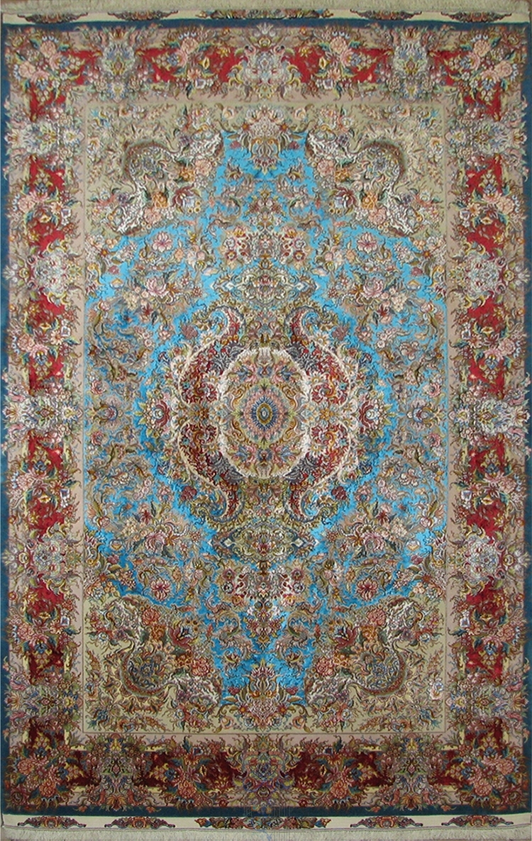 نمونه این طرح با انتخاب رنگهای جسورانه فیروزهای در کنار رنگ شرابی علاوه بر آنکه حوض ایرانی در کنار گلهای شمعدانی قرمز را تداعی میکند، حس قدرت، اعتماد به نفس، درخشندگی و شادی را برمیانگیزد.