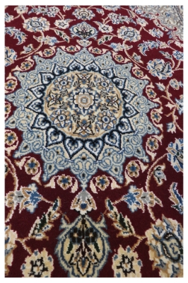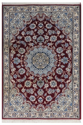 قالیچه 9لا نایین، دارای چله نخ، پرزهای پشم و ابریشم ، رنگ لاکی برای زمینه و رنگ کرم برای حاشیه ها، با گره فارسی در نایین بافته شده است .